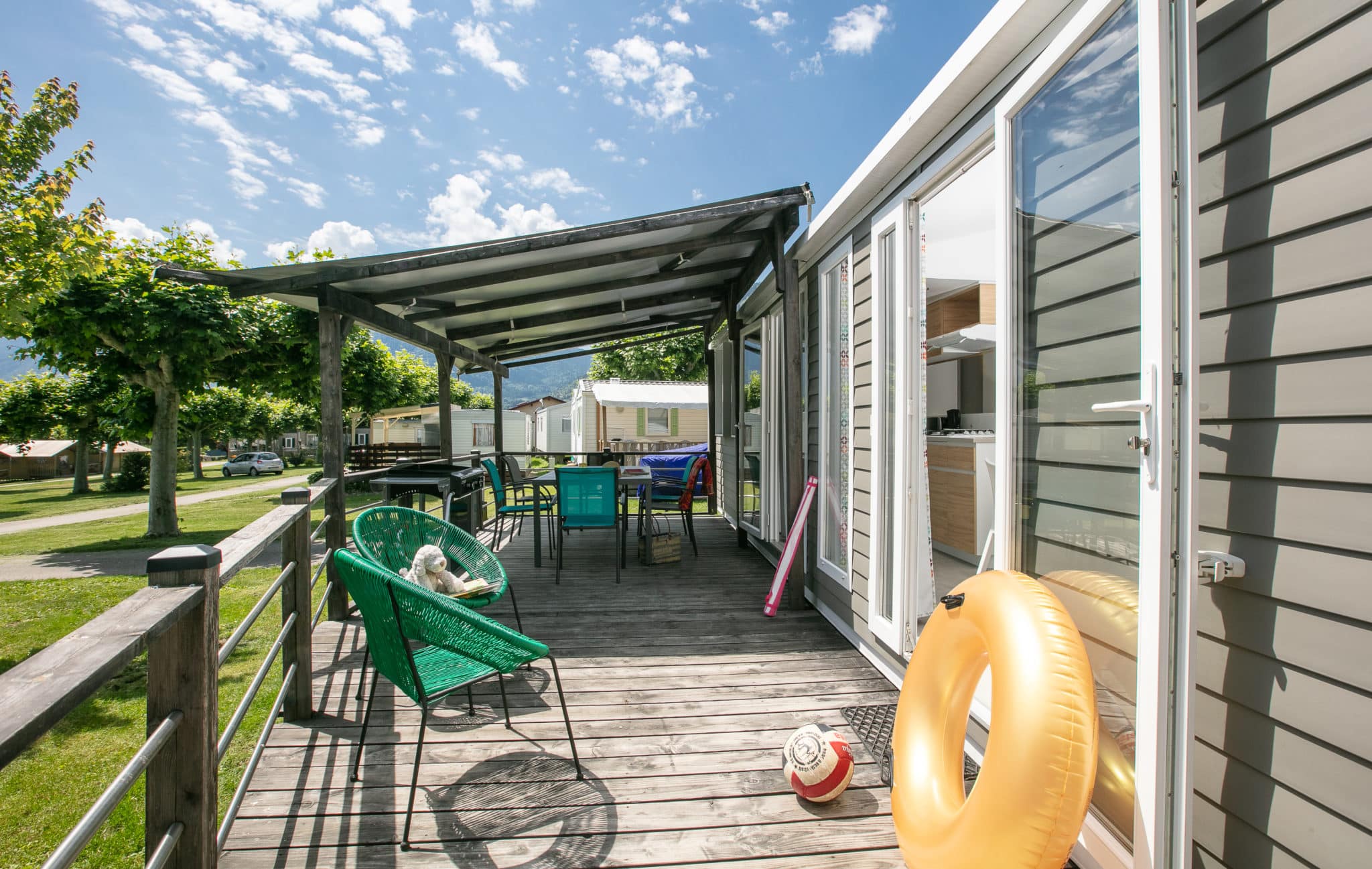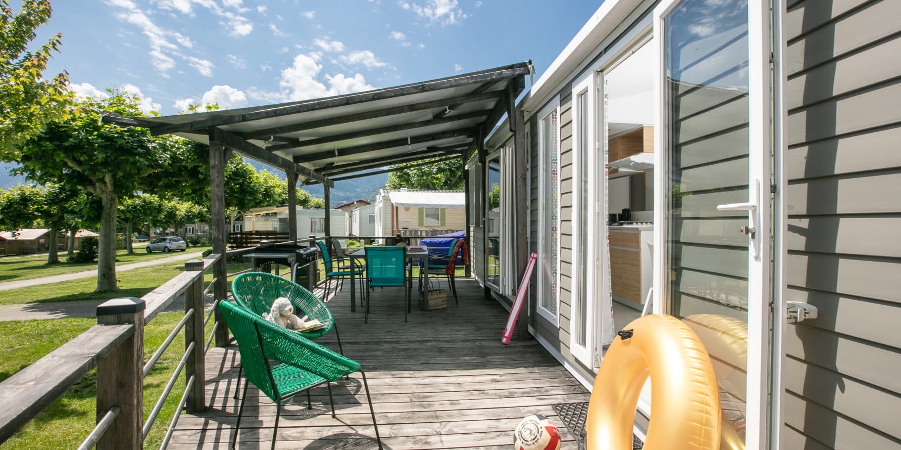 Les deux chambres à lits simples disposent également d’une salle d’eau et de toilettes séparées. Ce grand mobil-home climatisé à louer au lac d’Annecy est idéal pour des vacances en famille ou entre amis.