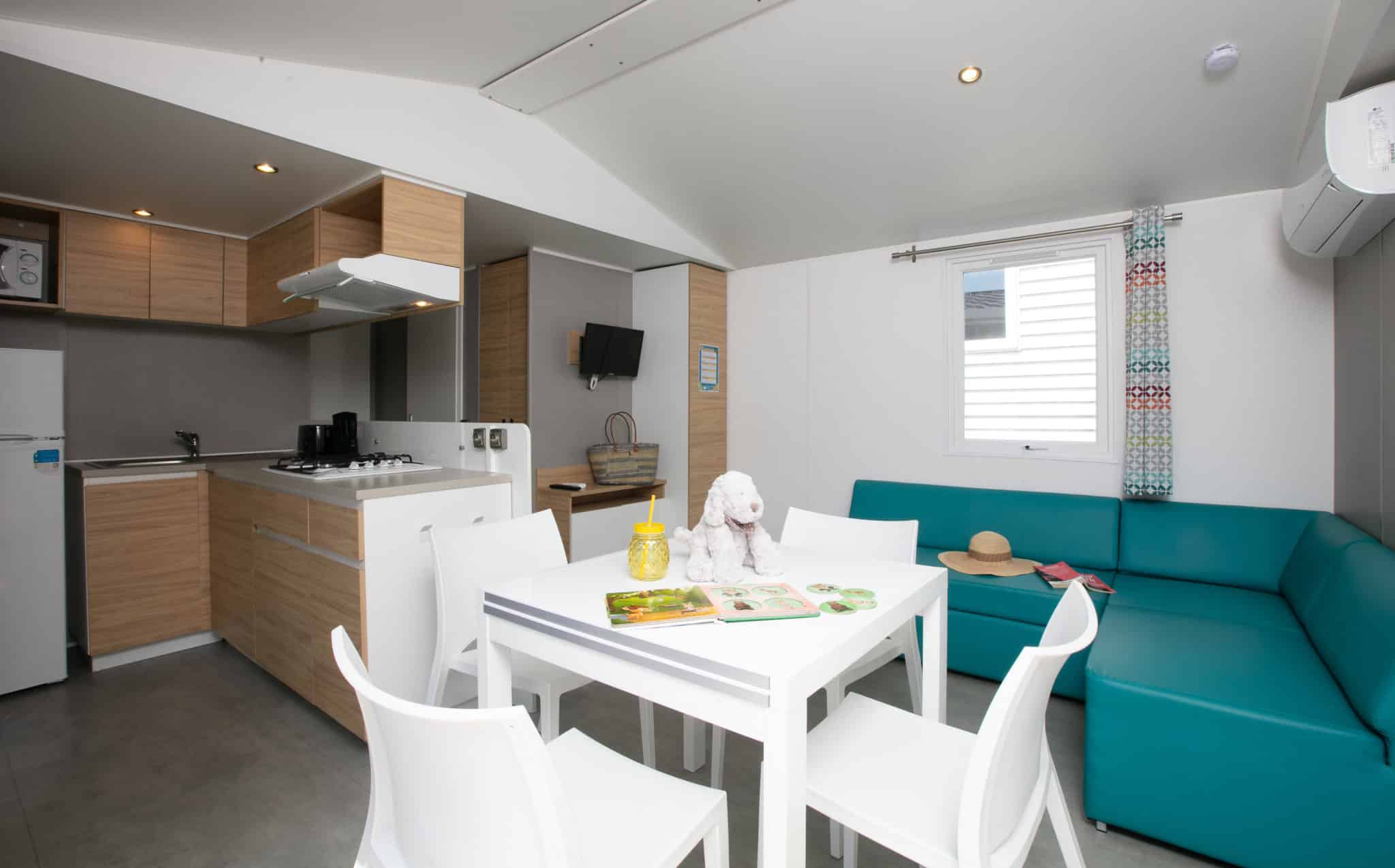 Mobil-home moderne et spacieux, le Cottage Premium 6p offre une surface à vivre de plus de 38 m² pouvant accueillir jusqu’à 6 personnes dans des conditions de confort optimales : autour d’une vaste pièce à vivre sont réparties 3 chambres, dont une suite parentale qui bénéficie de sa propre salle d’eau et de ses WC indépendants.